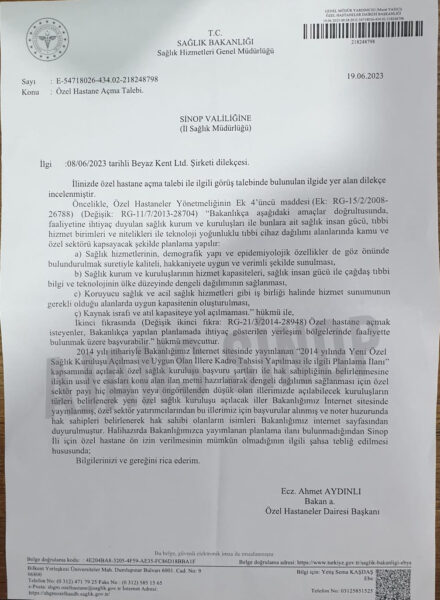 Sağlık Bakanlığı, özel hastane müracaatında bulunan İş İnsanı Hüseyin Yüksek’e cevaben yazdığı resmi yazıda ; “ Dilekçeniz bakanlığımızca incelenmiş ve hali hazırda bakanlığımızca yayımlanan planlama ilanı bulunmadığından Sinop İli için özel hastane ön izni verilmesinin mümkün olmadığı belirtilmiştir.” Denildi.