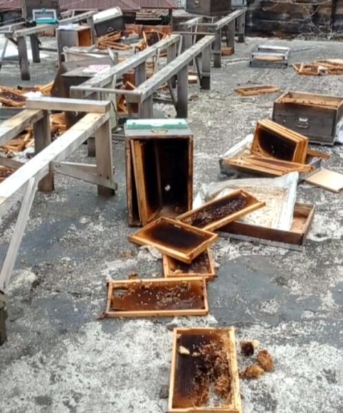 Ayıların erişememesi için iki katlı evinin terasına kovanlarını yerleştiren Öztürk, 20 adet kovanın ayılar tarafından parçalanmış halde olduğunu gördü. Mal zararının 25 bin TL, sezonluk zararının ise 250-300 bin TL’ye yakın olduğunu söyledi. Terasın durumunu gören yetiştirici, karşılaştığı manzarayı cep telefonu kamerasına kaydetti.Duvardan tırmanarak çıkmışlarBölgede ayıların sık görüldüğünü, bu nedenle ayıların erişmemeleri için köy evinin çatısını kullandığını belirten Öztürk, “Kovanları terasta tutmak da çare olmadı. Etrafa baktığımızda duvardan tırmandıklarını gördük, bina iki katlı ve oturan yok. Sıvaları dökülmüş, tuğlaları deforme olmuş.
