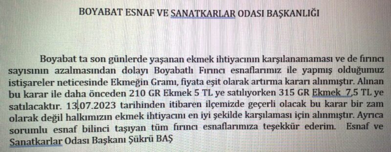 Başkan Şükrü Baş’tan Ekmek Fiyatı Güncellemesi ile İlgili Basın Açıklaması… 12 Temmuz 2023 Boyabat Gündemi GENEL 0 OKUYUCU & ZİYARETCİ KİŞİ -( 172