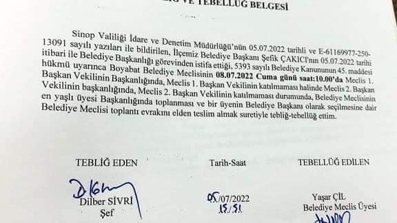 08.07.2022 Cuma Günü Boyabat Belediyesi Meclis 1. Başkanvekilinin başkanlığında yapılacak seçimde meclis üyeleri aralarından yeni başkanı belirleyecek.