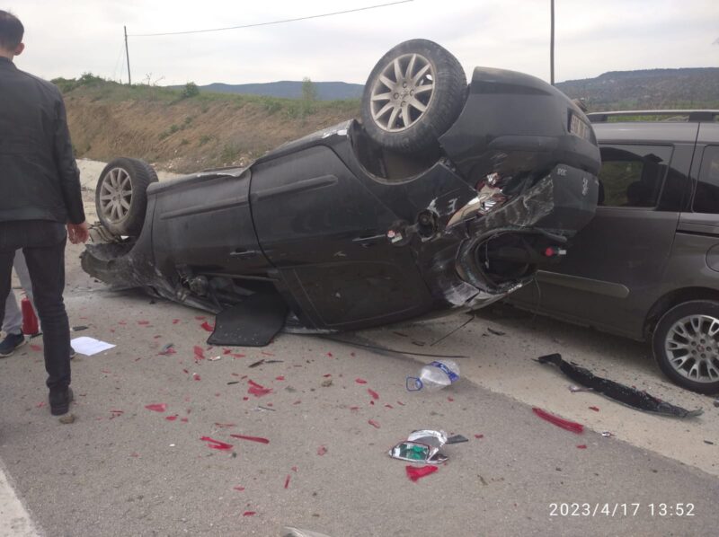 Yola atlayan köpeğe çarpmamak için takla atan araç karşı şeride geçerek yol kenarında duran otomobile çarparak durabildi.