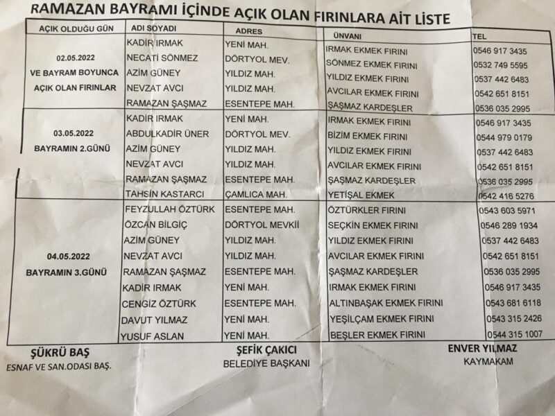 Boyabat’ta Bayramda Nöbetçi Fırınların Listesi Yayınlandı, Günlük 5Fırın Nöbetçi olacak… 1 Mayıs 2022 Boyabat Gündemi GENEL 0 OKUYUCU & ZİYARETCİ KİŞİ -( 171