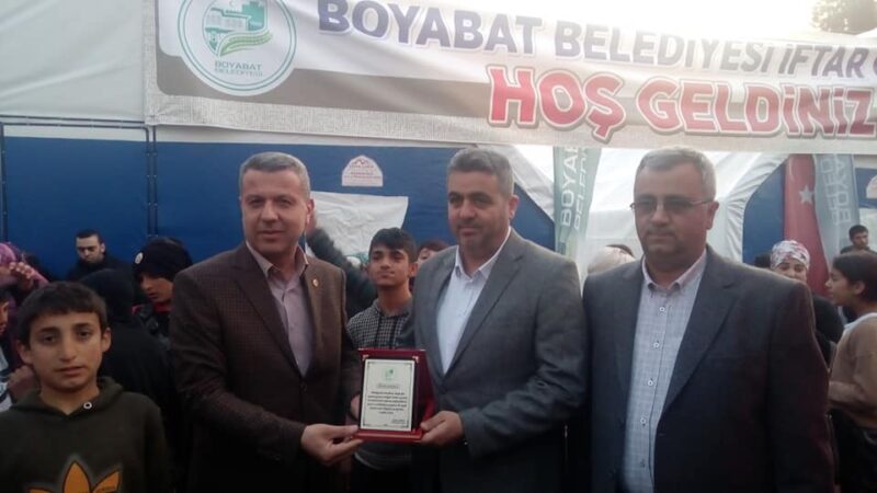 Ramazan ayı içerisinde Boyabat Belediye tarafından kurulan İftar çadırında bu akşam eski Orta çarşı esnaflarından tuzcu Mehmet Dodurgalı adına ailesi Esat ve Mehmet Dodurgalı tarafından iftar yemeği verildi.Belediye Başkanı Şefik Çakıcı merhum Mehmet Dodurgalı’ ya Allah’ tan rahmet diliyorum.Bu gece iftar soframızı kuran Esat ve Mehmet kardeşlerime ilçem adına teşekkür ederim diyerek plaket takdim etti.