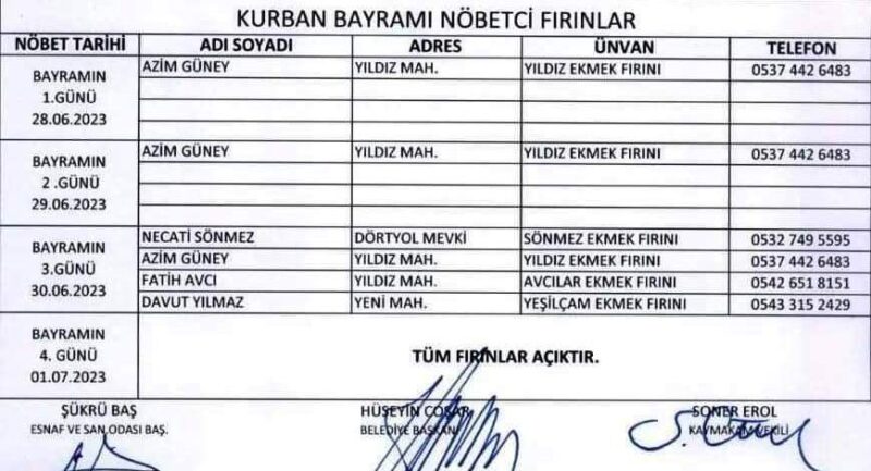 Boyabat’ta Kurban Bayramında Nöbetçi Fırınlar Belli Oldu… 24 Haziran 2023 Boyabat Gündemi GENEL 0 işte nöbetçi fırınların listesi OKUYUCU & ZİYARETCİ KİŞİ -( 199