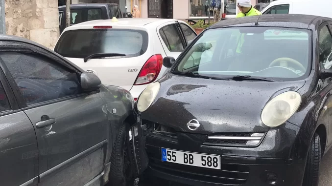 55 BB 588 plakalı aracın sürücüsü M.Ö (57), Sakarya Caddesi yönüne doğru ilerlemek istediği esnada aracın kaldırma çarpmasıyla panikleyip fren yerine gaza basarak yol kenarında park halinde bulunan iki araca çarptı. Kaza anında kaldırımda şans eseri yaya olmaması olası bir faciayı önledi.