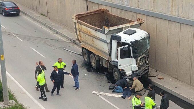Sinop’ta meydana gelen trafik kazasında bir kamyon yoldan çıkıp karşı şeride geçerek duvara çarptı.