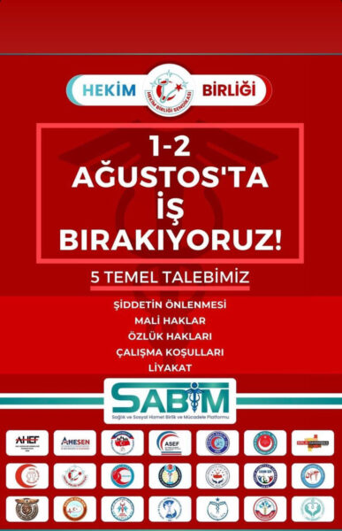 Hekim Birliği Sendikasına bağlı doktorlar 1-2 Ağustos’ta iş bıraktıklarını duyurdu. Hekimler 5 temel taleplerinin olduğunu belirtti. Buna göre hekimlerin talepleri şu şekilde; şiddetin önlenmesi, mali haklar, özlük hakları, çalışma koşulları ve liyakat olduğu ifade edildi.