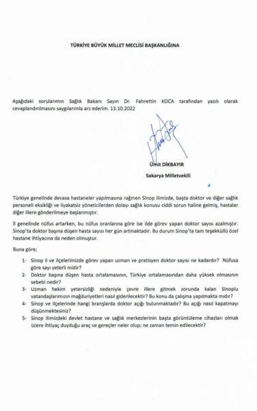 İYİ Parti Sakarya Milletvekili Ümit Dikbayır’ın, Sağlık Bakanı Koca’ya yanıtlanması talebiyle TBMM’yer verdiği o soru önergesi;