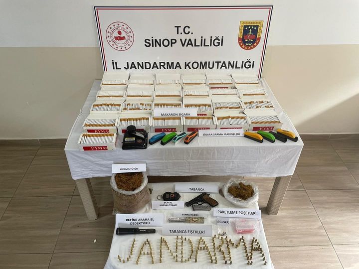 Sinop İl J.K.lığınca yapılan istihbari çalışmalar sonucunda; 12.10.2022 tarihinde Erfelek İlçesinde yapılan operasyonda (2) gr esrar, (1) adet baretta marka ruhsatsız tabanca, (119) adet tabanca fişeği, (2775) gr. kıyılmış tütün, (4950) adet dolu makaron, (