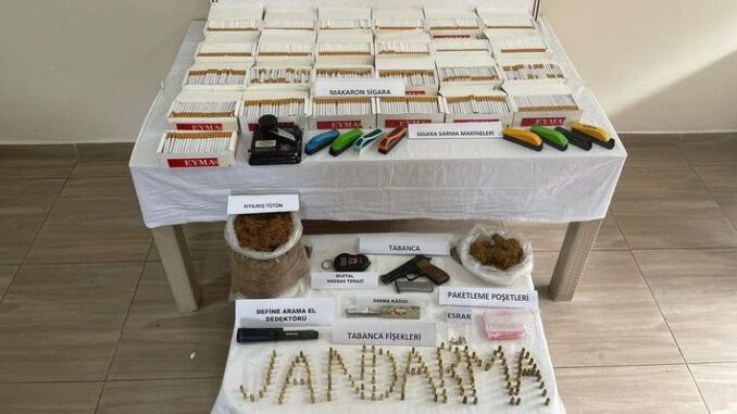 adet tütün sarma makinesi, (90) adet kilitli paketleme poşeti, (1) adet hassas terazi ve (1) adet define arama el dedektörü ele geçirilmiş olup olayla ilgili (3) şüpheli şahıs yakalanarak gözaltına alınmıştır.