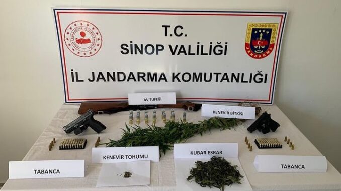 Sinop İl Jandarma Komutanlığınca, 23.09.2022 tarihinde Türkeli İlçesi Kayabaşı köyünde uyuşturucu satıcılarına yönelik yapılan operasyon neticesinde; (158) gr. kubar esrar, (7) kök kenevir bitkisi, (1) adet ruhsatsız av tüfeği, (1) adet ruhsatsız tabanca, (1) adet kurusıkı tabanca, (100) adet kurusıkı tabanca fişeği, (16) adet tabanca fişeği ve (13) adet av tüfeği fişeği ele geçirilmiş olup, olayla ilgili (1) şüpheli gözaltına alınmıştır.