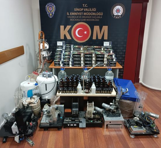 Sinop Merkeze bağlı bir köyde “kaçak sigara ve alkol imalathanesi” olarak kullanıldığı belirlenen bir adrese yapılan baskında ;