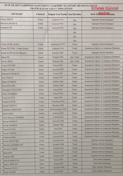Kaza Yapan Sinop Yolcu Otobüsünün Yolcu Listesi Yayınlandı!… 26 Ocak 2024 Boyabat Gündemi GENEL 0 Bugün Sabah saat 06.00 sıralarında İstanbul’dan Sinop giden yolcu otobüsü Taşköprü ilçesinde kaza yaptı , otobüste bulanan yolcuları listesi yayınlandı. OKUYUCU & ZİYARETCİ KİŞİ -( 195