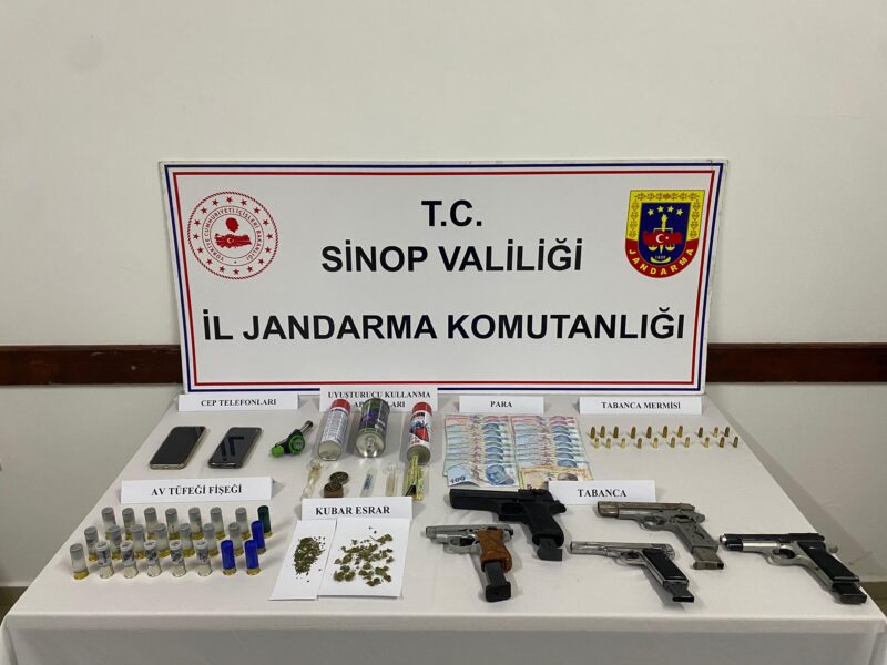 Şüphelilerin adreslerindeki aramalarda bir miktar uyuşturucu, 5 tabanca ve 24 av tüfeği fişeği ele geçirildi.