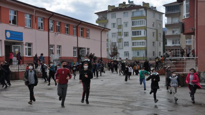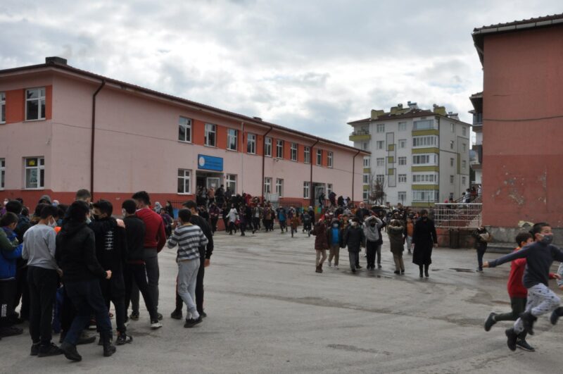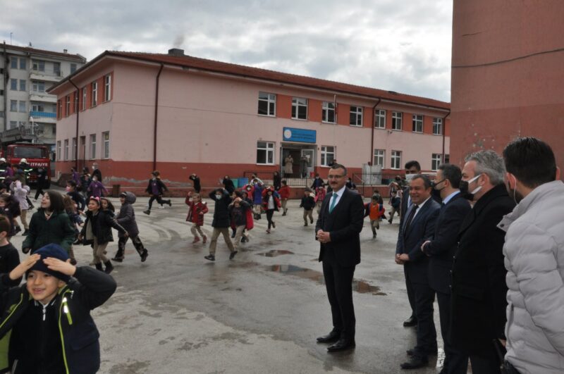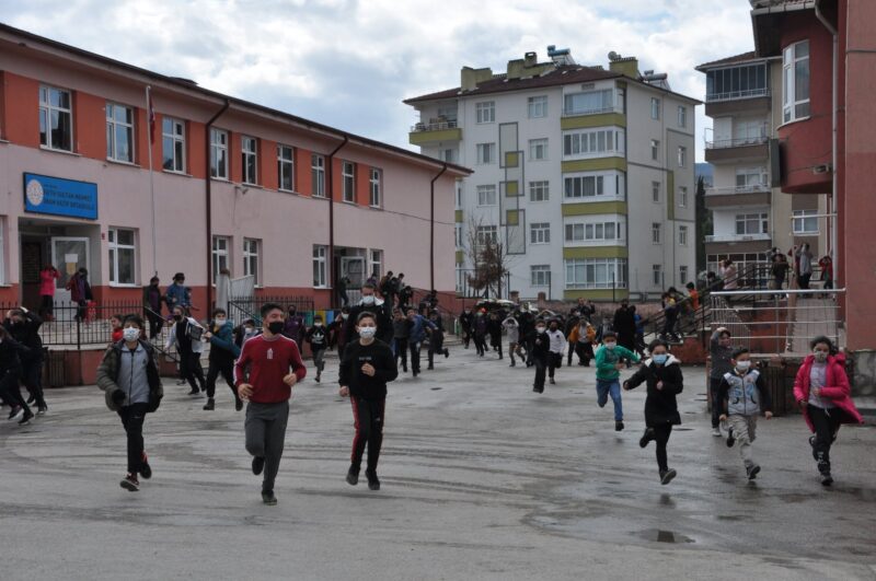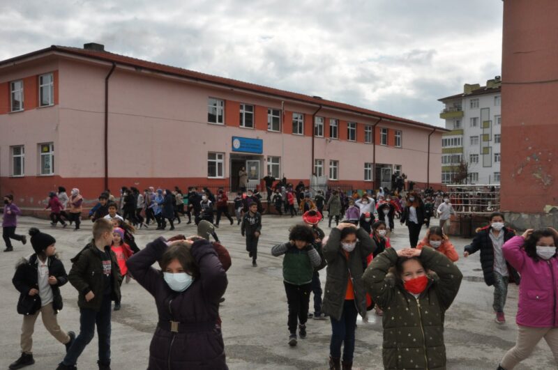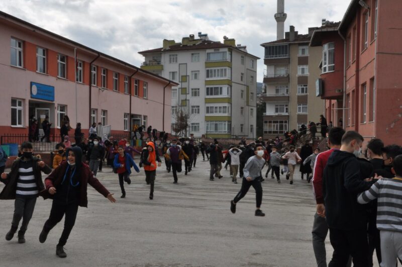 Tatbikat sonrası öğrencilerimiz deprem ve tahliye konusunda bilgilendirilerek tatbikat sona erdi