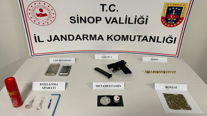 GERZE İlçesindeki yol kontrol ve arama noktasında durdurulan otobüste kimlik kontrolü yaparak önce şüpheli S.M.’yi tespit eden ekipler, şahsın üzerinde ve çantasında yaptıkları arama sonucunda yolcunun çantasından 27 gram bonzai, 12 gram metamfetamin, 1 tabanca, 2 cep telefonu ile uyuşturucu madde kullanma aparatı ele geçirdi. Jandarma ekiplerince gözaltına alınan şüpheli S.M.’ nin hakkında, yasal işlem başlatıldığı kaydedildi.