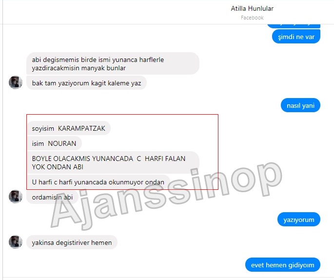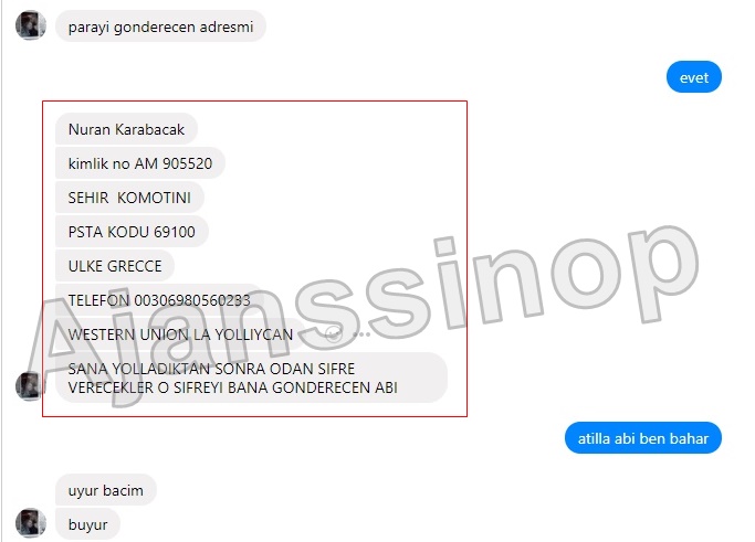Dolandırı Atilla Salih Mola söz konusu paranın Yunanistan’da yaşayan ve eşi olduğunu ileri sürdüğü Nuran Karabacak isimli kişiye gönderilmesi gerektiğini söylüyor. Paranın gönderileceği Nurdan Karabacak’ın isminin Yunan harfleri ile gönderilmesi gerekiyor.