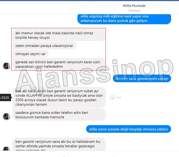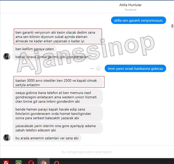 Dolandırıcı Atilla Molla Salih,’ Haydar Ö.’nün kızının işe girebilmesi için 3 bin Avro istendiğini, ancak pazarlıkla 2. 500 Avro’ya kadar indirdiğini söyledi. Paranın miktarını söylerken de; abi, ben garanti veriyorum, kesin olacak. Şubat ayında eleman alımı var, diyerek bir an önce paranın gönderilmesini istiyor’ dedi.
