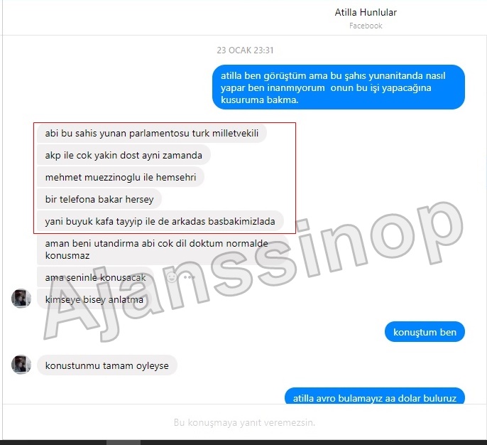 Dolandırıcı, para karşılığı Haydar Ö.’nün kızını işe yerleştirecek olan, ‘Ahmet’ isimli şahsın, Bursa İlahiyat Fakültesi mezunu olduğunu ve Cumhurbaşkanı Recep Tayyip Erdoğan’ı kastederek, ‘ Tayyip’le ve tüm Bakan’larla arasının iyi olduğunu, ayrıca bu kişinin Yunan Parlamentosunda Türk Azınlıklarının haklarını savunduğunu söylüyor.