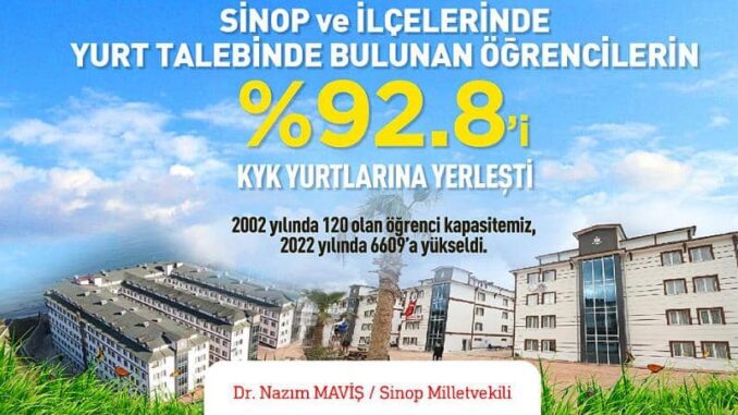 Sinop’ta son yıllarda hayata geçen yurt yatırımlarının ardından rekor sayıda öğrenci, KYK yurtlarına yerleşmeye hak kazandı. AK Parti Sinop Milletvekili Dr. Nazım Maviş, Sinop ve ilçelerde yurt talebinde bulunan öğrencilerin yüzde 92.8’inin KYK bünyesindeki yurtlara yerleştiğini ifade etti.