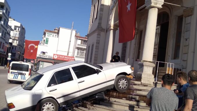 Sinop‘ta gaz pedalı takılı kalan otomobil, Adliye Sarayı binasının merdivenine çarparak durabildi.