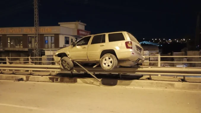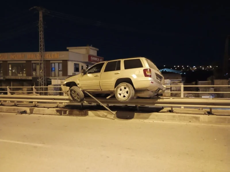 Sinop’ta kontrolden çıkan otomobil yol kenarındaki bariyerlerde asılı kaldı. Kaza, gece saat 03.00 sıralarında Ordu Mahallesi Sanayi Sitesi yakınlarında meydana geldi. Plakası ve sürücüsü henüz belirlenemeyen otomobil, kent merkezi yönünden Samsun istikametine seyir halindeyken sürücüsünün direksiyon hakimiyetini kaybetmesi sonucu yol kenarındaki bariyerlere çarparak asılı kaldı.