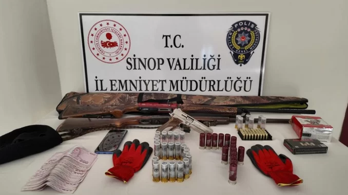 Sinop’un Ayancık ilçesinde bulunan bir iş yerinde kar maskeli bir şahıs tarafından gerçekleştirilen “Yağma – İşyerinden ve Kurumdan Hırsızlık olayı ile ilgili, Sinop İl Emniyet Müdürlüğü asayiş şube müdürlüğü tarafından olayın aydınlatılmasına yönelik yapılan 41 KGYS kamera analizi, 850 saat KGYS kamera izlemesi, saha ve eşgal analiz çalışmaları neticesinde şüpheli şahıs S.A., olarak tespit edilmiş olup Ayancık ilçesinde iki ayrı adrese yapılan operasyonda şüpheli şahıs saklanmış olduğu adreste yakalanmış, yapılan aramalarda şüphelinin olayda kullanmış olduğu 1 adet tabanca, 45 adet mermi, 3 adet kırmızı eldiven, 1 adet bot, 3 adet eldiven, 1 adet kar maskesi, hırsızlık konusu 9 bin TL., 2 adet Ruhsatsız tüfek ve 42 adet Fişek ele geçirildi.