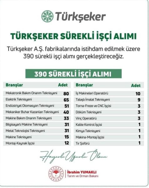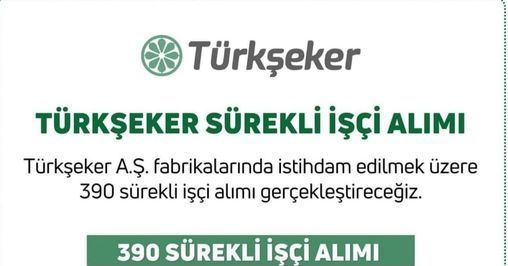 Türkiye Şeker Fabrikaları A.Ş. de çalıştırılmak üzere 4857 sayılı İş Kanunu kapsamında istihdam edilmek üzere toplam 390 sürekli işçi alımına ilişkin ilan şartları 22-26 Nisan 2024 tarihleri arasında www.iskur.gov.tr internet adresinden yapılacaktır.