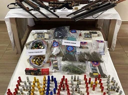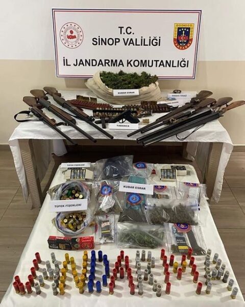 Sinop İl J.K.lığınca; 18.10.2022 günü Sinop İl Merkez ve Erfelek İlçesinde Uyuşturucu Madde Satıcılarına yönelik 5 farklı adrese eş zamanlı yapılan operasyon neticesinde; (2868) gr kubar esrar, (50) gr. kenevir tohumu, (1) adet tabanca, (7) adet ruhsatsız av tüfeği, (296) adet av tüfeği fişeği, (28) adet tabanca fişeği, (4) paket sarma kağıdı, ve (1) adet hassas terazi ele geçirilmiş olup olayla ilgili adli işlemlere başlanmıştır.
