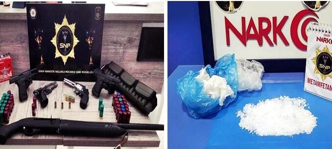 Zanlılara ait adreslerde yapılan aramalarda bir adet ruhsatsız uzun namlulu tüfek, 4 kurusıkı tabanca, bir miktar uyuşturucu madde metamfetamin ve uyuşturucu kullanım aparatları ele geçirildi.Emniyetteki işlemlerinin ardından adliyeye sevk edilen zanlılardan 2’si çıkarıldığı hakimlikçe tutuklandı.