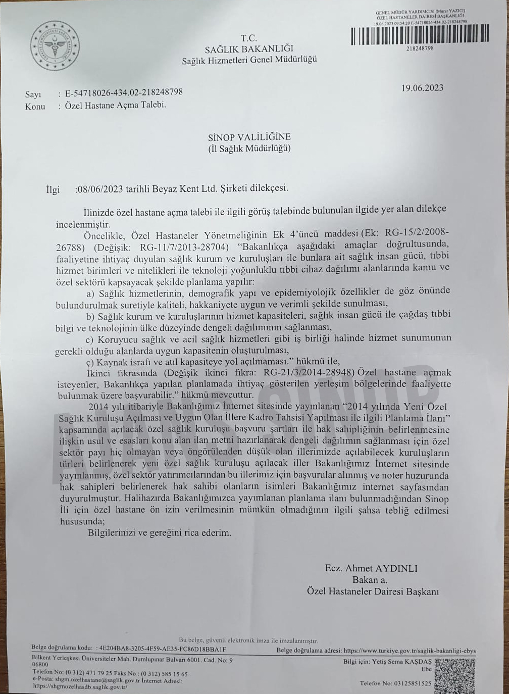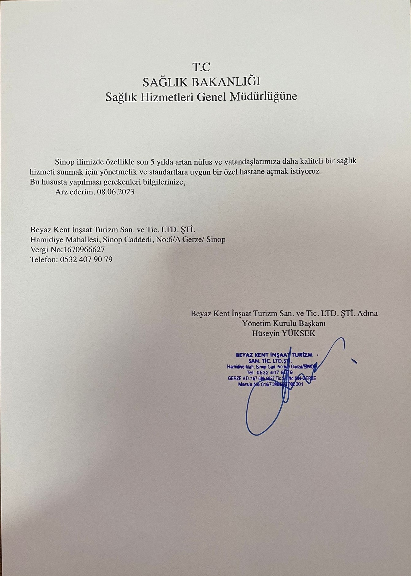 Sinop’un en büyük noksanları arasında yer alan özel hastane krizini ortandan kaldırmak isteyen Gerzeli İş nsanı Hüseyin Yüksek, 2023 yılında Sağlık bakanlığına özel hastane ruhsatı için müracaat etmişti. Bakanlık ise ; ” Bakanlığımızca yayımlanan planlama ilanı bulunmadığından Sinop İli için özel hastane ön izni verilmesinin mümkün değil.” Demişti.