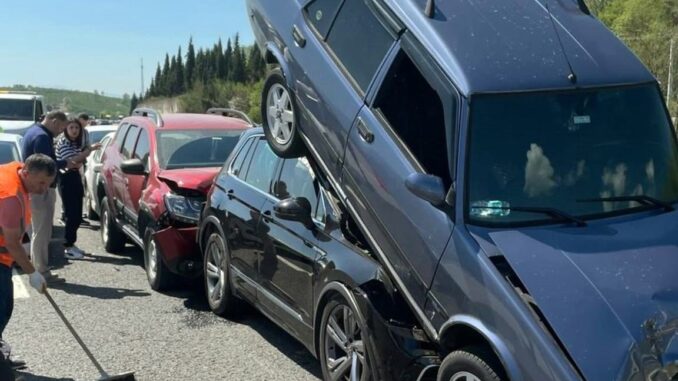 Bayram tatili sebebi ile yoğunluğun yaşandığı Anadolu Otoyolu Sakarya geçişinde meydana gelen 9 araçlı zincirleme trafik kazasında iki kişi yaralandı.